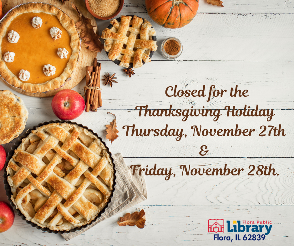 The Flora Public Library will be closed for the Thanksgiving Holiday on Thursday, November 27th and Friday, November 28th. We will be open on Saturday, November 29th from10 am-3 pm.