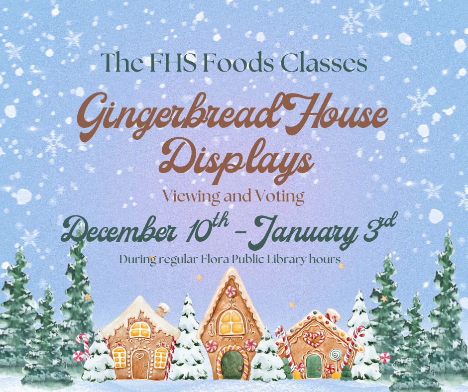 It's Christmas time and the Flora High School Foods Classes have their gingerbread houses on display in our Community Room! You are invited to come and vote on your favorite gingerbread house displays now through January 3rd during our regular library hours.