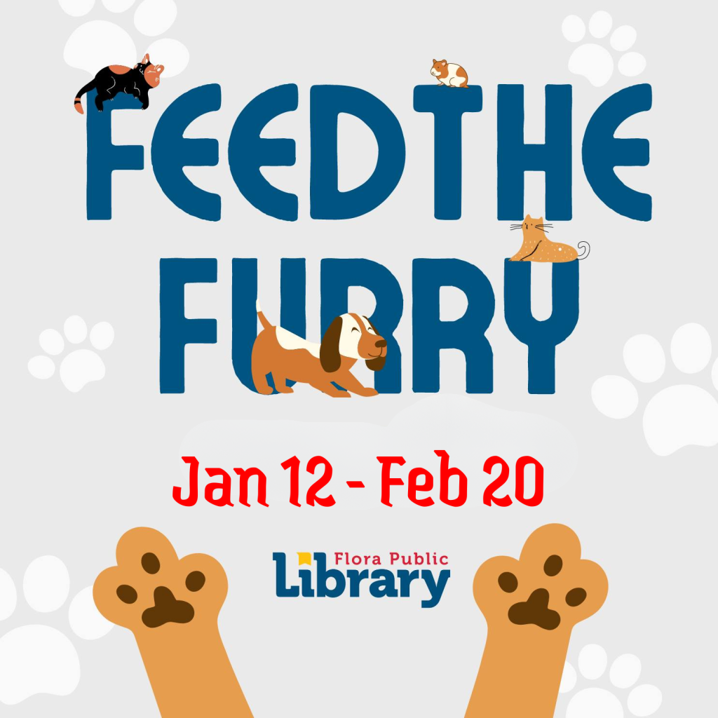 Feed the Furry January 30, 2026 Posted in: Events Flora Public Library in cooperation with Fur-A-Good Paws is sponsoring a pet food drive, “Feed the Furry” again this year! Donations can be dropped off at the Flora Public Library now thru February 20, 2026 during our open hours. Share: